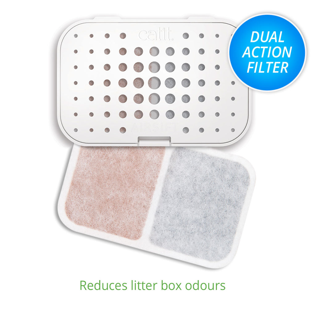 The Catit Airsift filter pad that fits inside the holder helps to reduce foul litter box odours by combining two cat-friendly filter media: Catit Magic Blue Ammonia Buster PLUS activated carbon, for higher efficacy. One Airsift filter pad last for approximately 30 days (based on a single to two-cat household).