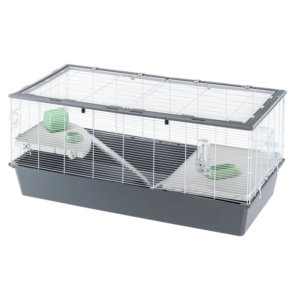 Criceti 120 comes complete with accessories that are indispensable for the animals' well-being: an exercise wheel, a feeder, a food bowl, a resting nest and a drinking bottle with stainless steel spout to ensure water is always available. The included accessories can be positioned freely within the cage, adapting to your little friend's habits.