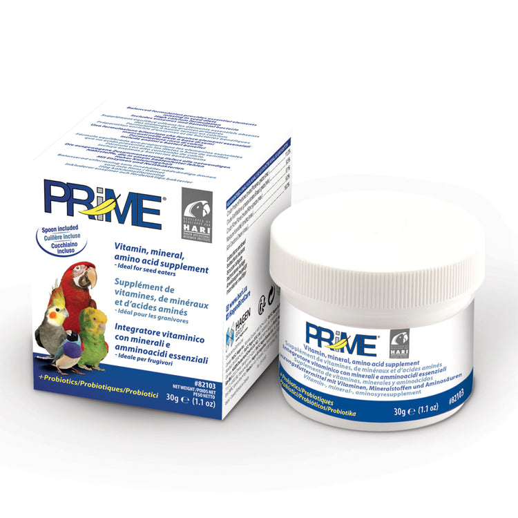 PRIME adds 14 essential vitamins and 9 minerals missing in commercially prepared seed mixtures for companion birds. As well it provides proper quantities of two limiting amino acids – Lysine and Methionine – which cannot be produced by birds, but are vital to growth and proper protein metabolism.