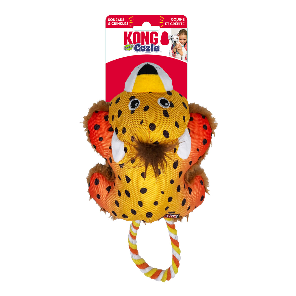 Cozie Tuggz Cheetah’s rope handle is made from sturdy cotton rope knotted inside his body for instinct-satisfying tugging action. He squeaks and crinkles to keep the fun going for lots of healthy interactive play. Soft plush fur invites soothing snuggles between bouts of tug-of-war.