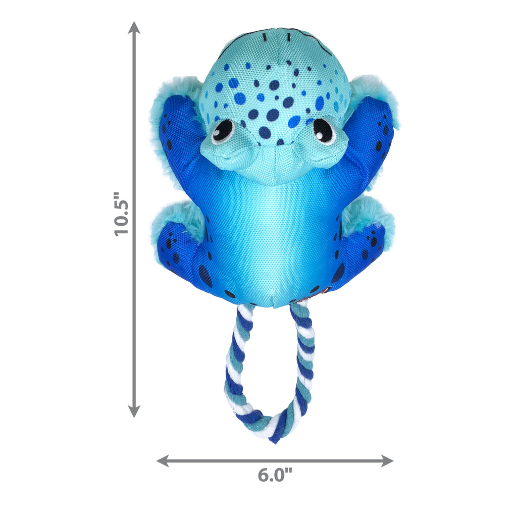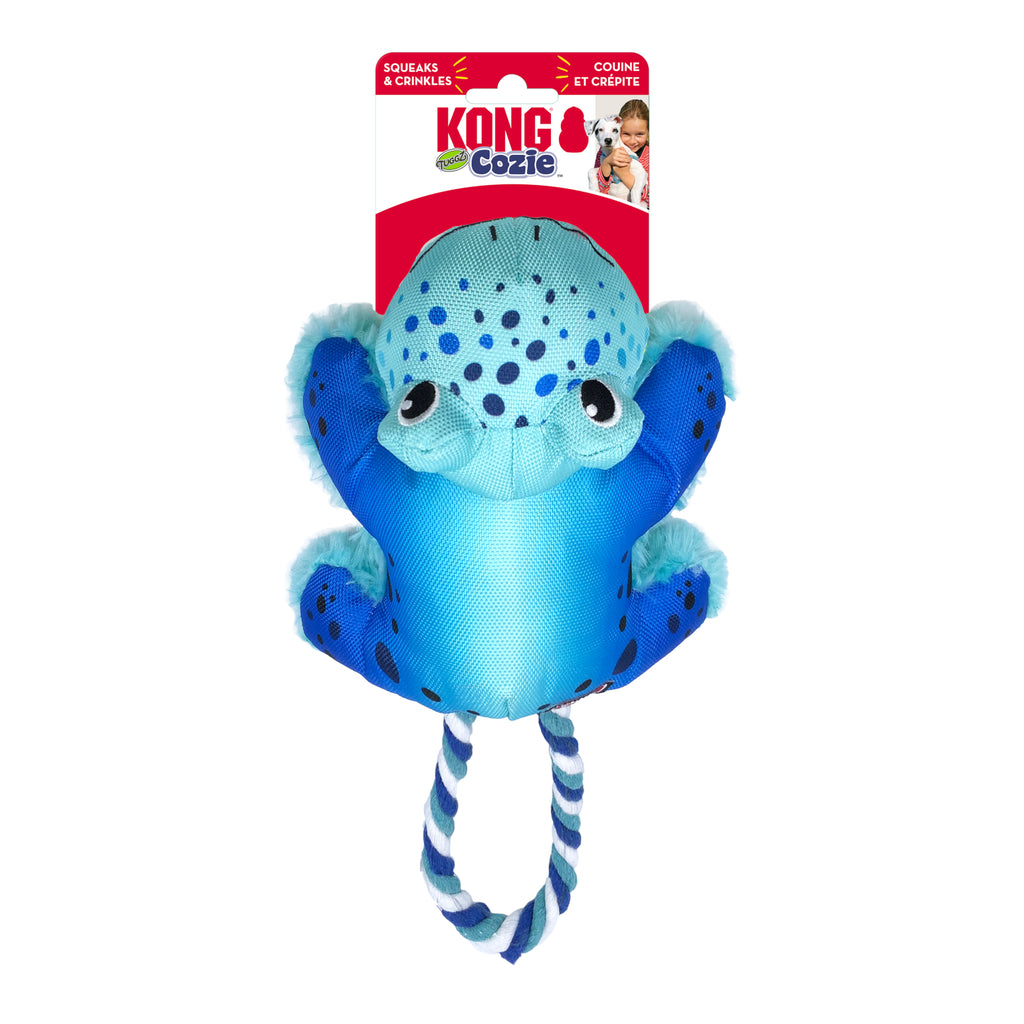 Cozie Tuggz Frog’s rope handle is made from sturdy cotton rope knotted inside his body for instinct-satisfying tugging action. He squeaks and crinkles to keep the fun going for lots of healthy interactive play. Soft plush fur invites soothing snuggles between bouts of tug-of-war.