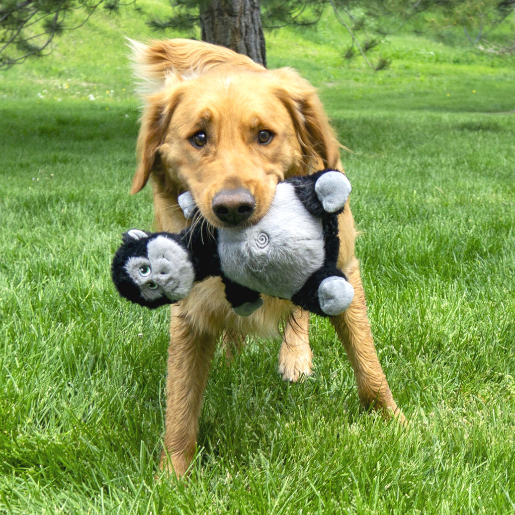 KONG Knots Belly Gorilla is soft and cuddly on the outside with a strong, durable rope ball on the inside making its belly round and weighty. This dense internal skeleton rope ball adds heft and movement that entices instinctual thrashing, flinging, and light chewing. A squeaker in this gorilla’s head piques dogs’ interest and adds excitement to play sessions. Knots Belly Gorilla is also ideal for dogs who like to carry their toys, as well as for naptime snuggles. Have fun watching which way your dog likes to engage with this multifunctional toy!