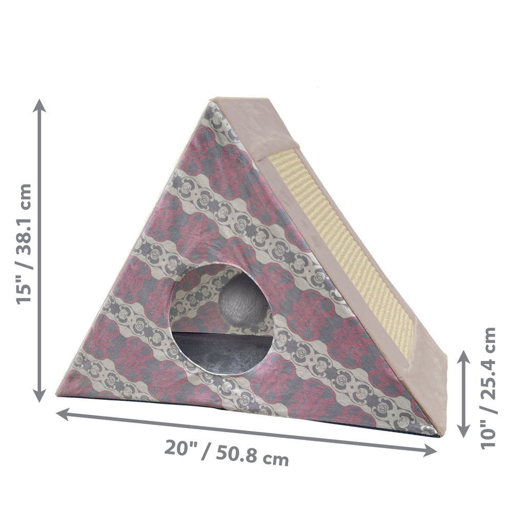 KONG Play Spaces Zen Den is a Bermuda Triangle of tempting, multi-sensory enrichment options where cats can lose themselves in hide-and-peek fun. Large scratching surface on the outside satisfies instincts while a bell-filled plush ball dangles inside, inviting batting. Super soft plush bedding inside beckons when kitties need a snooze between bouts of healthy, active play.