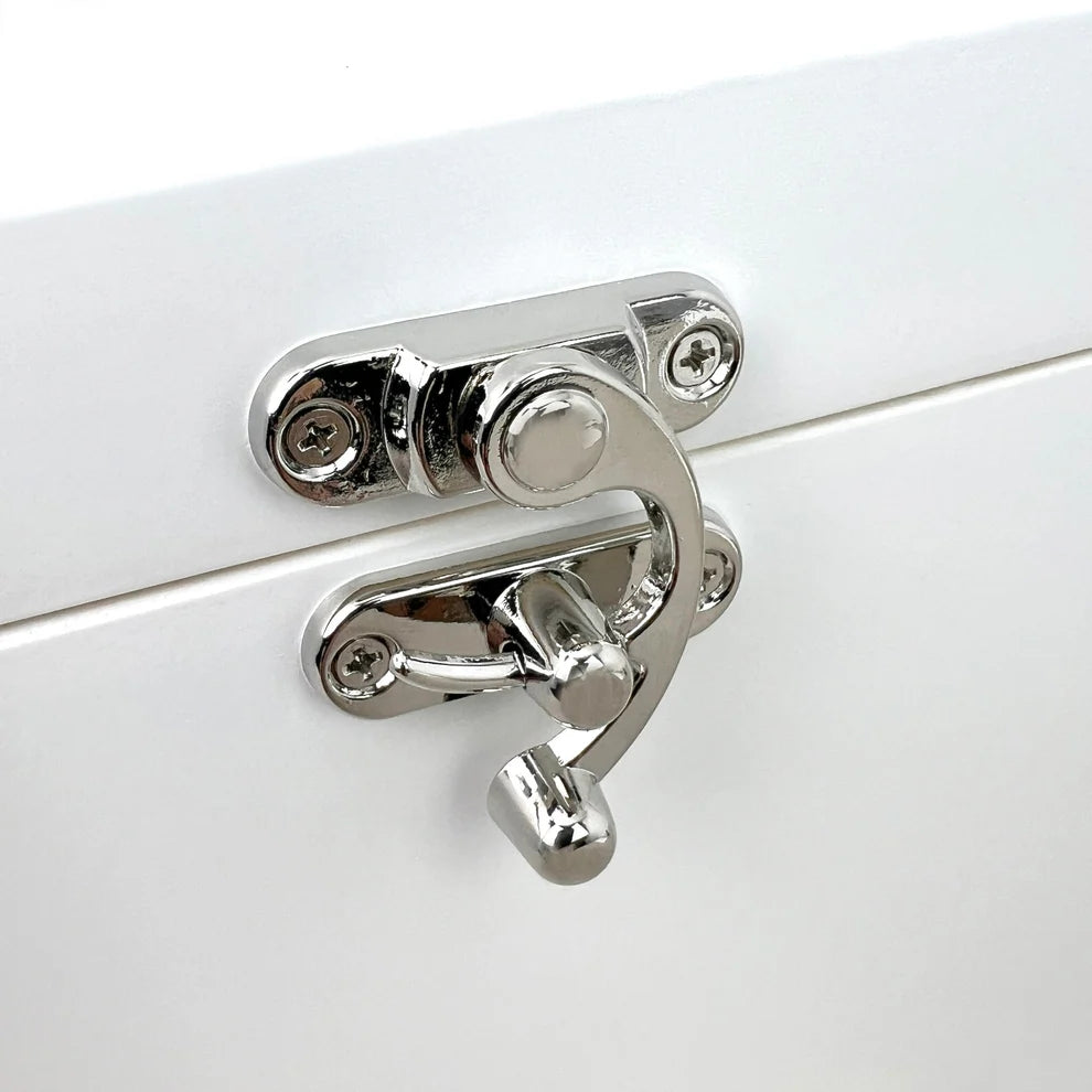 The sturdy wooden box is made from white painted solid pine wood. The boxes have chrome plated metal hinges and an elegant clasp to seal the box ensuring its contents are safe for years to come.