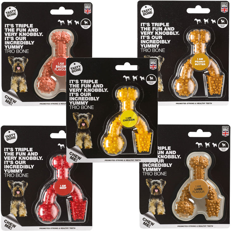 It’s triple the fun and very knobbly. It’s our incredibly yummy Trio Bone. Like all of our nylon chews, this TastyBone product has been tested on the most vigorous of chewers.