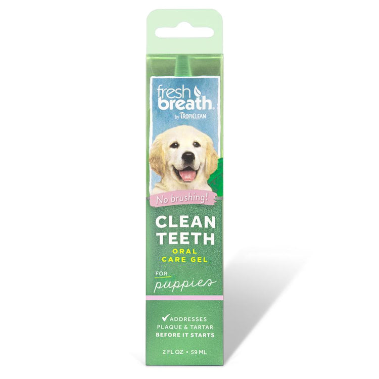 Our Fresh Breath Clean Teeth Gel for Puppies has a unique blend of powerful, natural ingredients that help defend against plaque and tartar before it starts, providing fresh breath for friendlier smooches. Clean teeth, fresh breath, no brushing! For puppies 12 weeks & up.